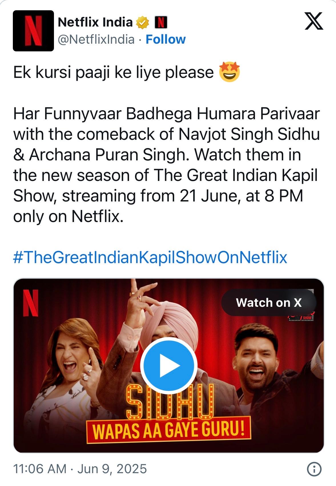 पूर्व क्रिकेटर नवजोत सिंह सिद्धू कपिल शर्मा के कॉमेडी शो के तीसरे सीजन के साथ वापसी करने के लिए तैयार हैं, निर्माताओं ने सोमवार को इसकी घोषणा की। विज्ञापन सिद्धू 2013 से 2016 के बीच “कॉमेडी नाइट्स विद कपिल” के स्थायी अतिथि थे। वह “द कपिल शर्मा शो” और “फैमिली टाइम विद कपिल शर्मा” के पहले दो सीजन में भी दिखाई दिए थे। “द ग्रेट इंडियन कपिल शो 3” 21 जून से नेटफ्लिक्स पर स्ट्रीम होगा। स्ट्रीमिंग प्लेटफॉर्म ने अपने इंस्टाग्राम हैंडल पर एक वीडियो के साथ घोषणा साझा की। “एक कुर्सी पाजी के लिए प्लीज। नवजोत सिंह सिद्धू और अर्चना पूरन सिंह की वापसी के साथ हर फनीवार बढ़ेगा हमारा परिवार। उन्हें द ग्रेट इंडियन कपिल शो के नए सीजन में देखें, 21 जून से रात 8 बजे