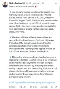 FASTag Based Annual Pass: рд╣рд╛рдИрд╡реЗ рдкрд░ рд╕рдлрд░ рдХрд░рдиреЗ рд╡рд╛рд▓реЛрдВ рдХреЗ рд▓рд┐рдП рдПрдХ рдмрдбрд╝реА рд░рд╛рд╣рдд рдХреА рдЦрдмрд░ рдЖрдИ рд╣реИ. рдХреЗрдВрджреНрд░реАрдп рд╕рдбрд╝рдХ рдкрд░рд┐рд╡рд╣рди рдПрд╡рдВ рд░рд╛рдЬрдорд╛рд░реНрдЧ рдордВрддреНрд░реА рдирд┐рддрд┐рди рдЧрдбрдХрд░реА рдиреЗ рдмреБрдзрд╡рд╛рд░ рдХреЛ рдПрдХреНрд╕ (X) рдкрд░ рдПрдХ рдкреЛрд╕реНрдЯ рдХреЗ рдЬрд░рд┐рдП FASTag рдЖрдзрд╛рд░рд┐рдд рд╡рд╛рд░реНрд╖рд┐рдХ рдкрд╛рд╕ (Annual Pass) рдХреА рдШреЛрд╖рдгрд╛ рдХреА рд╣реИ. рдпрд╣ рд╕реБрд╡рд┐рдзрд╛ 15 рдЕрдЧрд╕реНрдд 2025 рд╕реЗ рд▓рд╛рдЧреВ рд╣реЛрдЧреА. рдЗрд╕рдХрд╛ рдЙрджреНрджреЗрд╢реНрдп рд╣рд╛рдИрд╡реЗ рдпрд╛рддреНрд░рд┐рдпреЛрдВ рдХреЛ рдЯреЛрд▓ рднреБрдЧрддрд╛рди рдХреЗ рдЭрдВрдЭрдЯ рд╕реЗ рдореБрдХреНрдд рдХрд░рд╛рдирд╛ рд╣реИ рдФрд░ рд╕рдлрд░ рдХреЛ рдЕрдзрд┐рдХ рд╕реБрд╡рд┐рдзрд╛рдЬрдирдХ рдмрдирд╛рдирд╛ рд╣реИ.