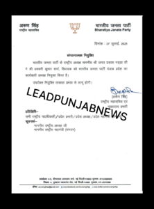 LEADPUNJABNEWS:рднрд╛рд░рддреАрдп рдЬрдирддрд╛ рдкрд╛рд░реНрдЯреА рдиреЗ рд╡рд┐рдзрд╛рдпрдХ рдЕрд╢реНрд╡рд┐рдиреА рдХреБрдорд╛рд░ рд╢рд░реНрдорд╛ рдХреЛ рдмрдбрд╝реА рдЬрд┐рдореНрдореЗрджрд╛рд░реА рд╕реМрдВрдкреА рд╣реИред рдЙрдиреНрд╣реЗрдВ рднрд╛рдЬрдкрд╛ рдкрдВрдЬрд╛рдм рдкреНрд░рджреЗрд╢ рдХрд╛ рдХрд╛рд░реНрдпрдХрд╛рд░реА рдЕрдзреНрдпрдХреНрд╖ рдирд┐рдпреБрдХреНрдд рдХрд┐рдпрд╛ рдЧрдпрд╛ рд╣реИред рдЗрд╕ рд╕рдВрдмрдВрдз рдореЗрдВ рдкрдВрдЬрд╛рдм рднрд╛рдЬрдкрд╛ рдХреА рдУрд░ рд╕реЗ рдПрдХ рдкрддреНрд░ рднреА рдЬрд╛рд░реА рдХрд┐рдпрд╛ рдЧрдпрд╛ рд╣реИред